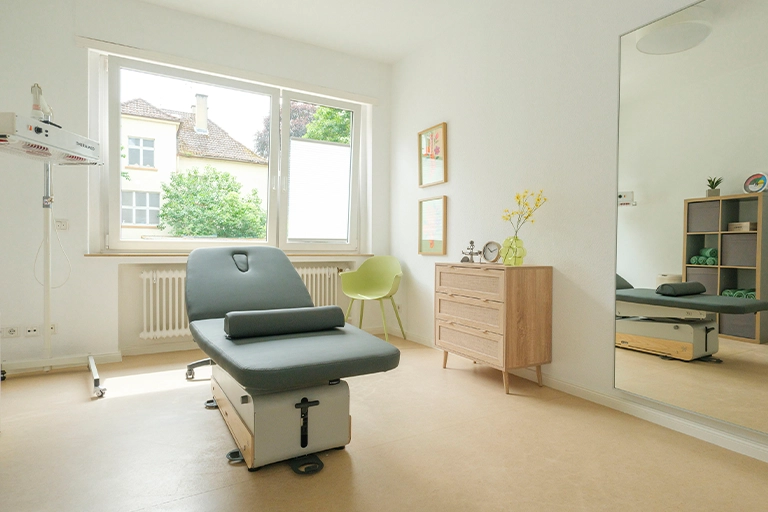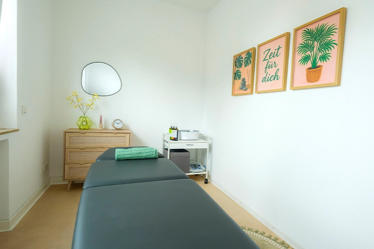 Wir verfügen über drei großzügige Behandlungsräume, in denen du individuell betreut wirst. Zusätzlich bieten wir einen komfortablen Wellnessraum für entspannte Therapien und ein modernes Wartezimmer, das dir eine angenehme Atmosphäre vor der Behandlung bietet. So kannst du dich bereits beim Ankommen rundum wohlfühlen und entspannen.